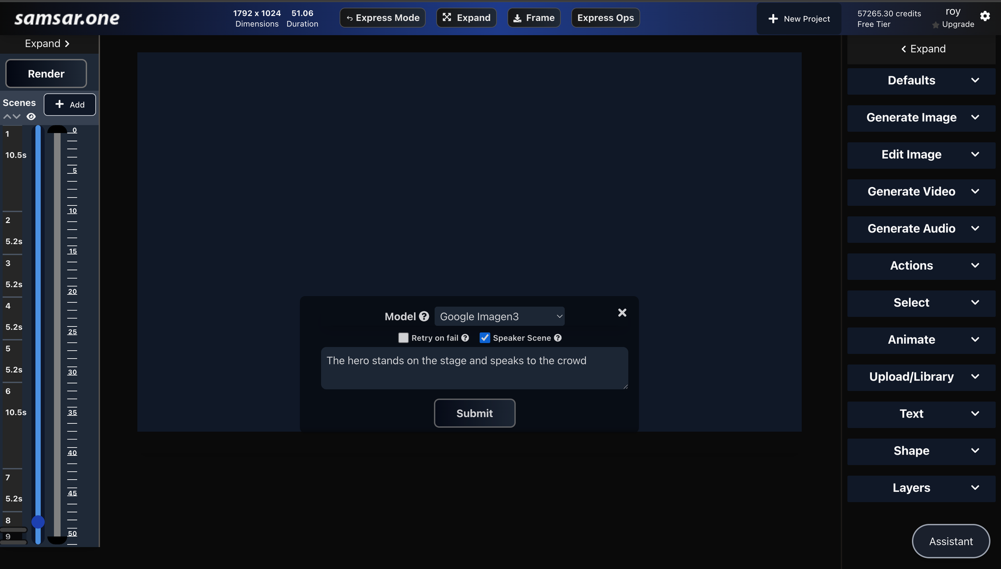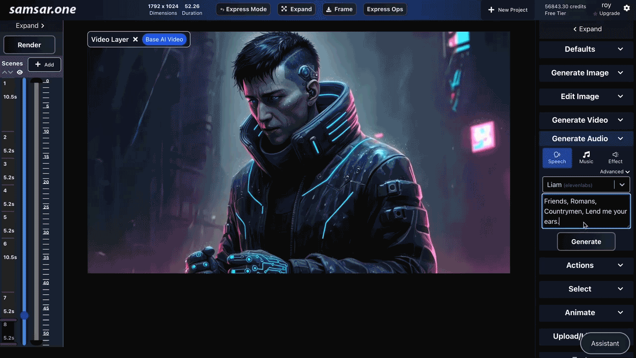 6. Preview the speech and add to your project at a start timestamp.