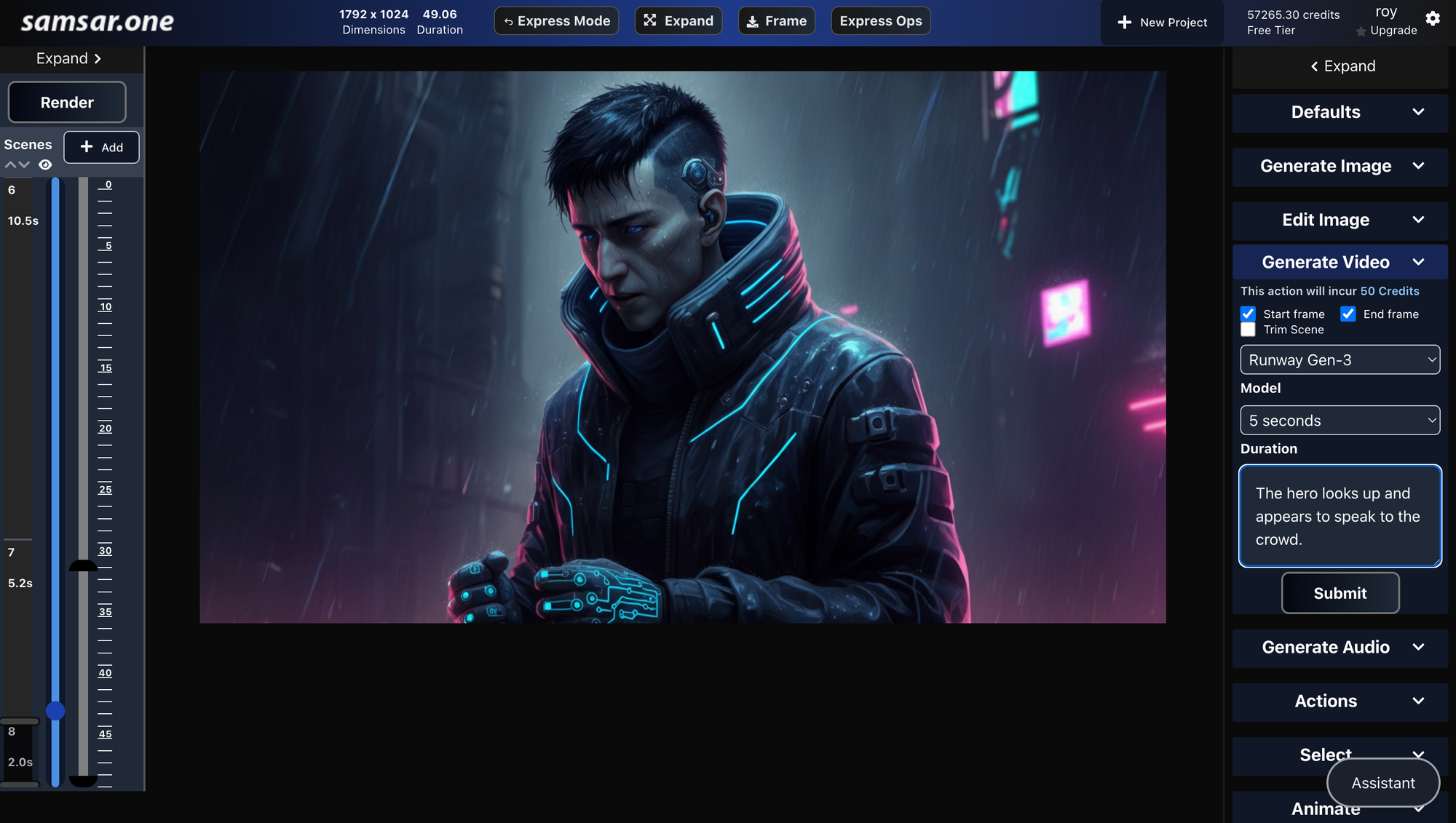 That's it—you now have your lip-synced scene for the character. Connect it with narrative, sound-effect, or base generative video scenes, or even plain image scenes with canvas animations, to create your movie. Hit render when finished. You can also check "Notify via Email" in your settings if you don't wanna wait for the render to finish and want to be notified once your video project completes.